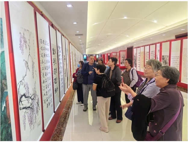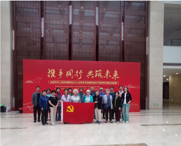 为庆祝中华人民共和国成立75周年,深入贯彻落实习近平总书记关于京津冀协同发展重要论述精神,落实《京津冀老干部工作协作交流机制框架协议》,引领离退休干部更好融入京津冀协同发展大局,9月20日,离退休工作处组织老年大学书画班部分老同志赴天津市老干部活动中心参观“携手同行 共筑未来”——京津冀离退休干部优秀书画作品联展(天津站)。